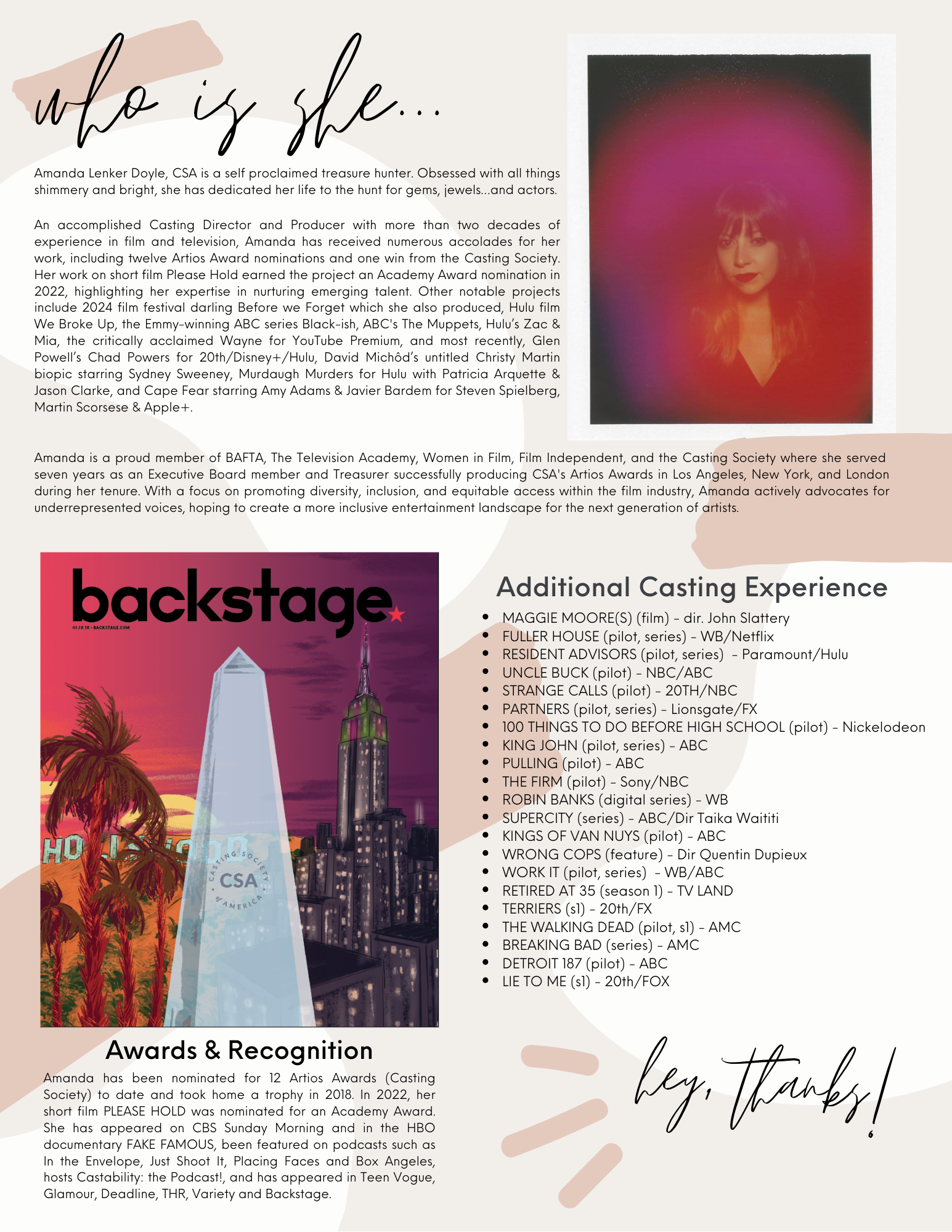 Amanda is a proud member of BAFTA, Women in Film, The Television Academy, Film Independent, and the Casting Society where she served seven years as an Executive Board member and Treasurer successfully producing CSA's Artios Awards in Los Angeles, New York, and London during her tenure. With a focus on promoting inclusion, and equitable access within the film industry, Amanda actively advocates for underrepresented voices, hoping to create a more inclusive entertainment landscape for the next generation of artists.